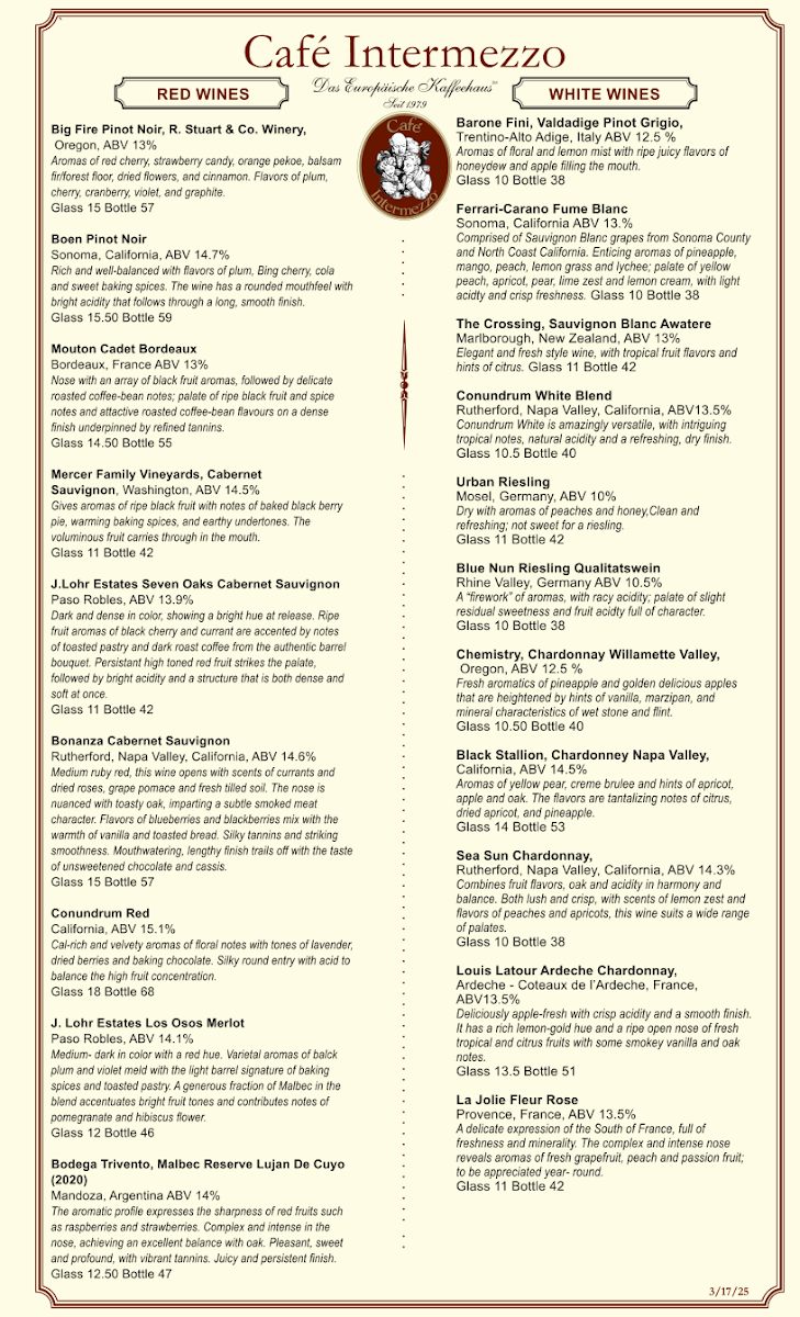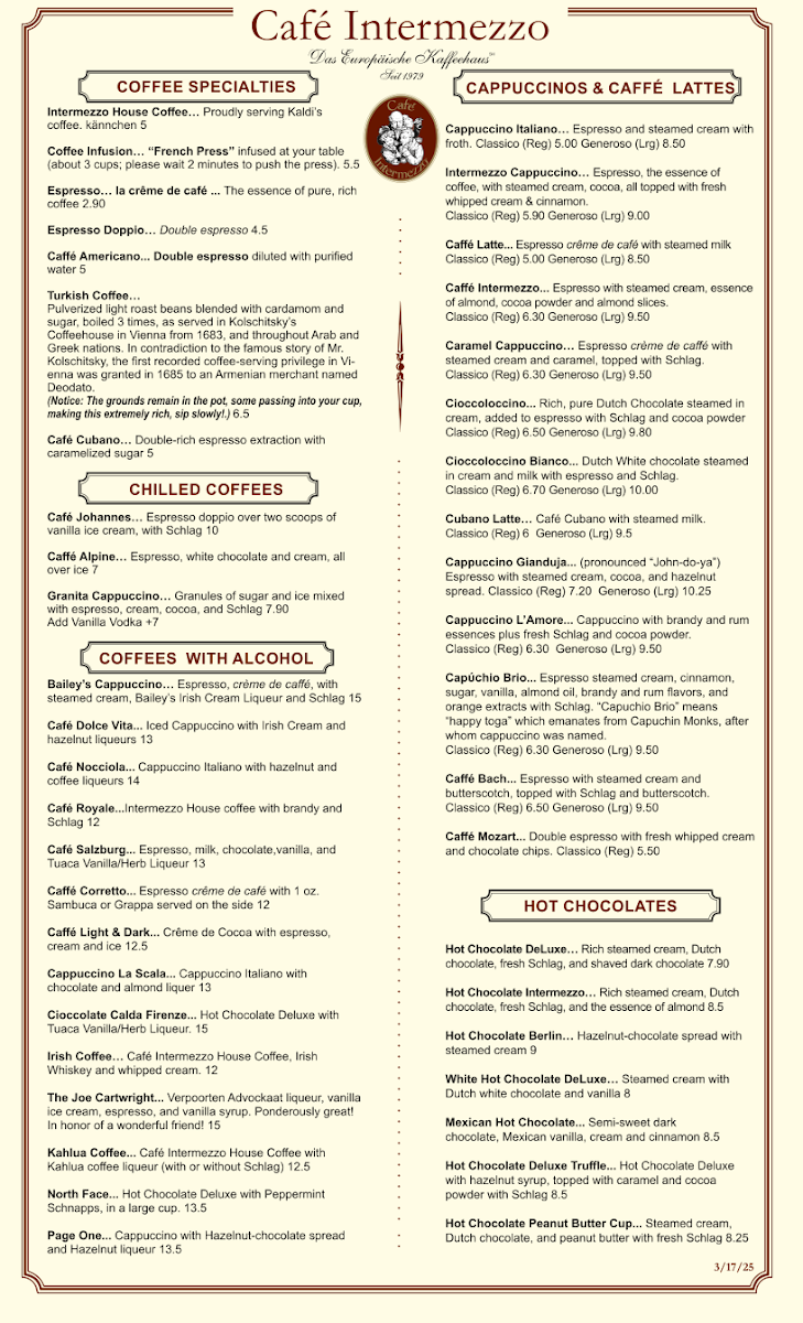 Don’t forget to save room for dessert! Café Intermezzo is renowned for its exquisite selection of pastries and desserts. Treat yourself to a slice of their famous Cheesecake with Schlag or indulge in a delightful Nutella-Banana Crêpe. Each bite is a celebration of flavors that will leave you craving more.